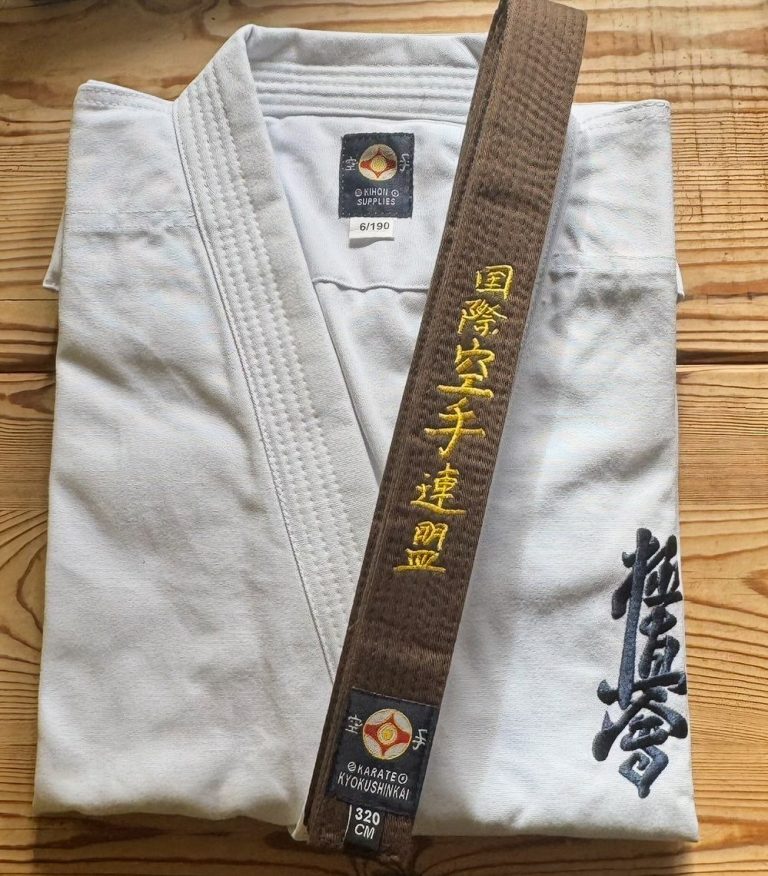 Karate Gi embroidered with the Kyokushin Kanji on left chest. the Gi comes in two weights, 12oz and 14oz and in a variety of sizes. This high quality Gi is provided through our preferred partner, Kihon Supplies and therefore please ask for prices.